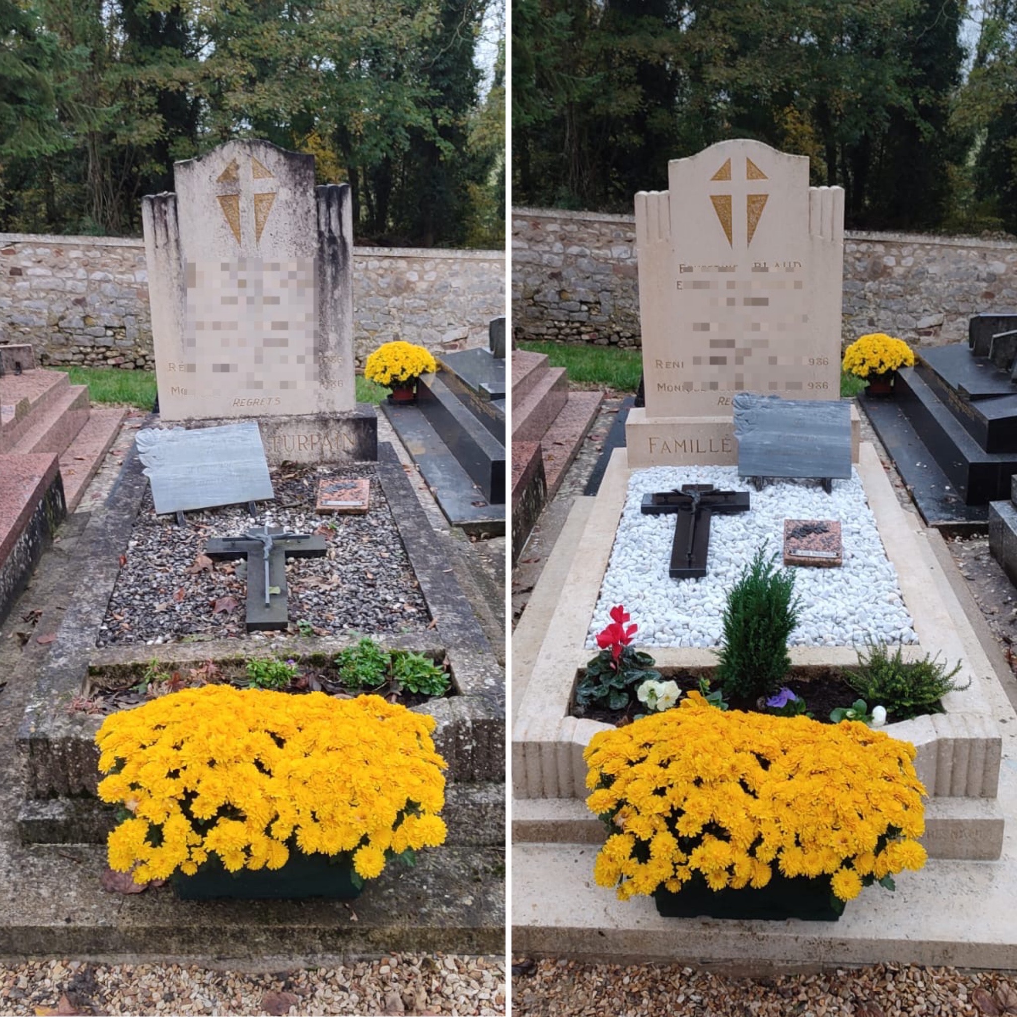 Chaque intervention comprend un nettoyage approfondi du monument funéraire, un désherbage soigné, le fleurissement saisonnier et l’envoi systématique de photos avant et après travaux pour garantir transparence et sérénité aux familles.