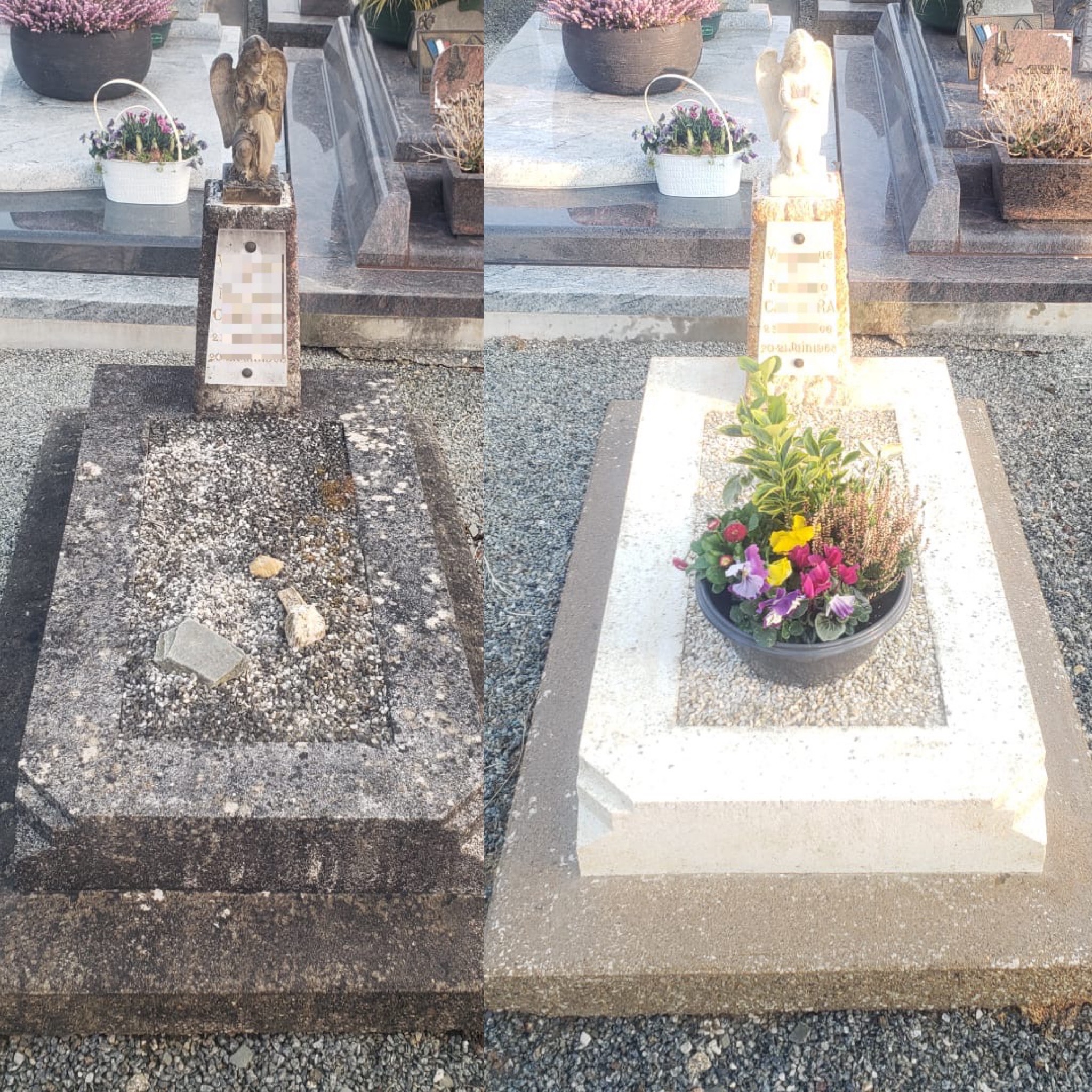 - Entretien paysager : Désherbage minutieux, nettoyage des abords, remise en ordre des éléments décoratifs et de l'ensemble de la concession