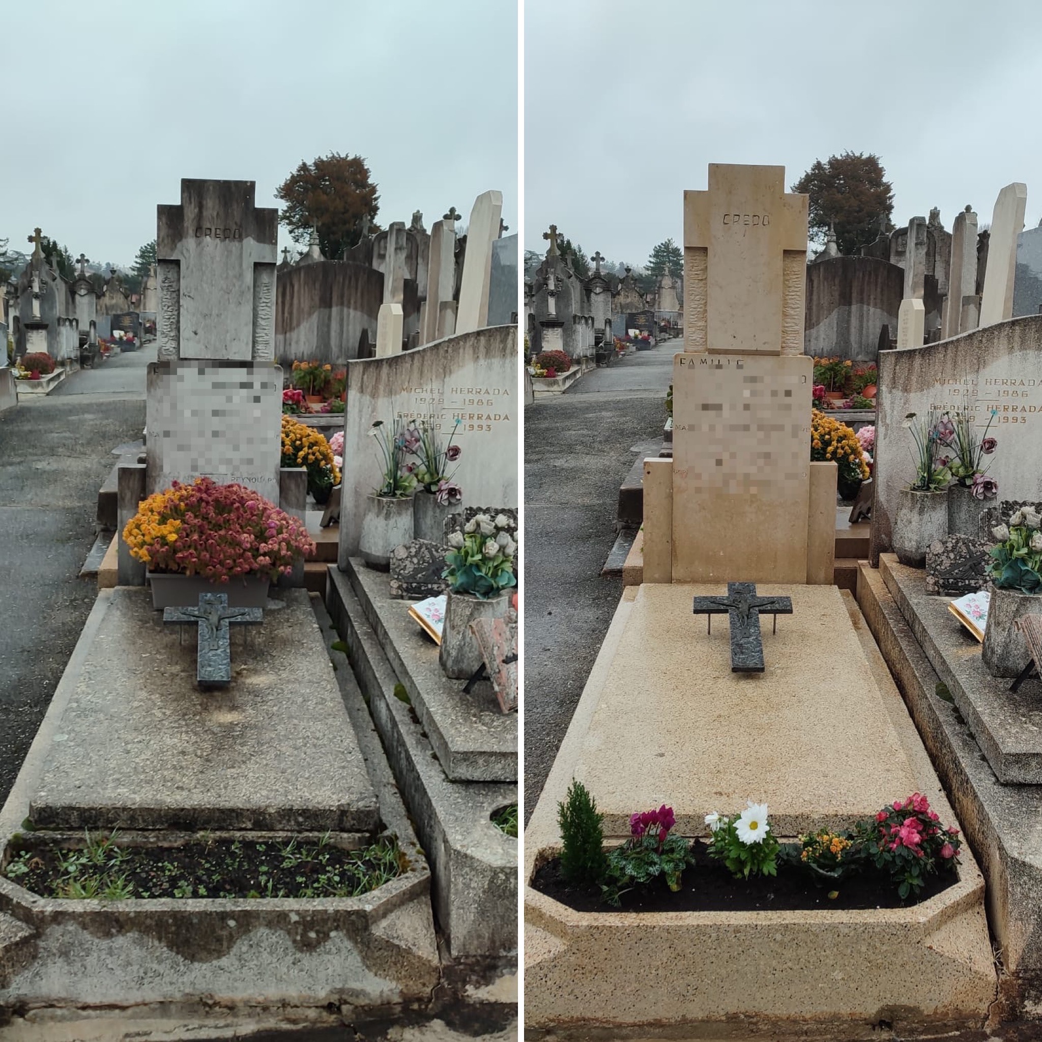 Chaque intervention inclut un nettoyage délicat et respectueux des matériaux, un désherbage précis, le fleurissement des tombes selon la saison, ainsi qu’un rapport photographique systématique envoyé aux familles pour garantir la transparence.
