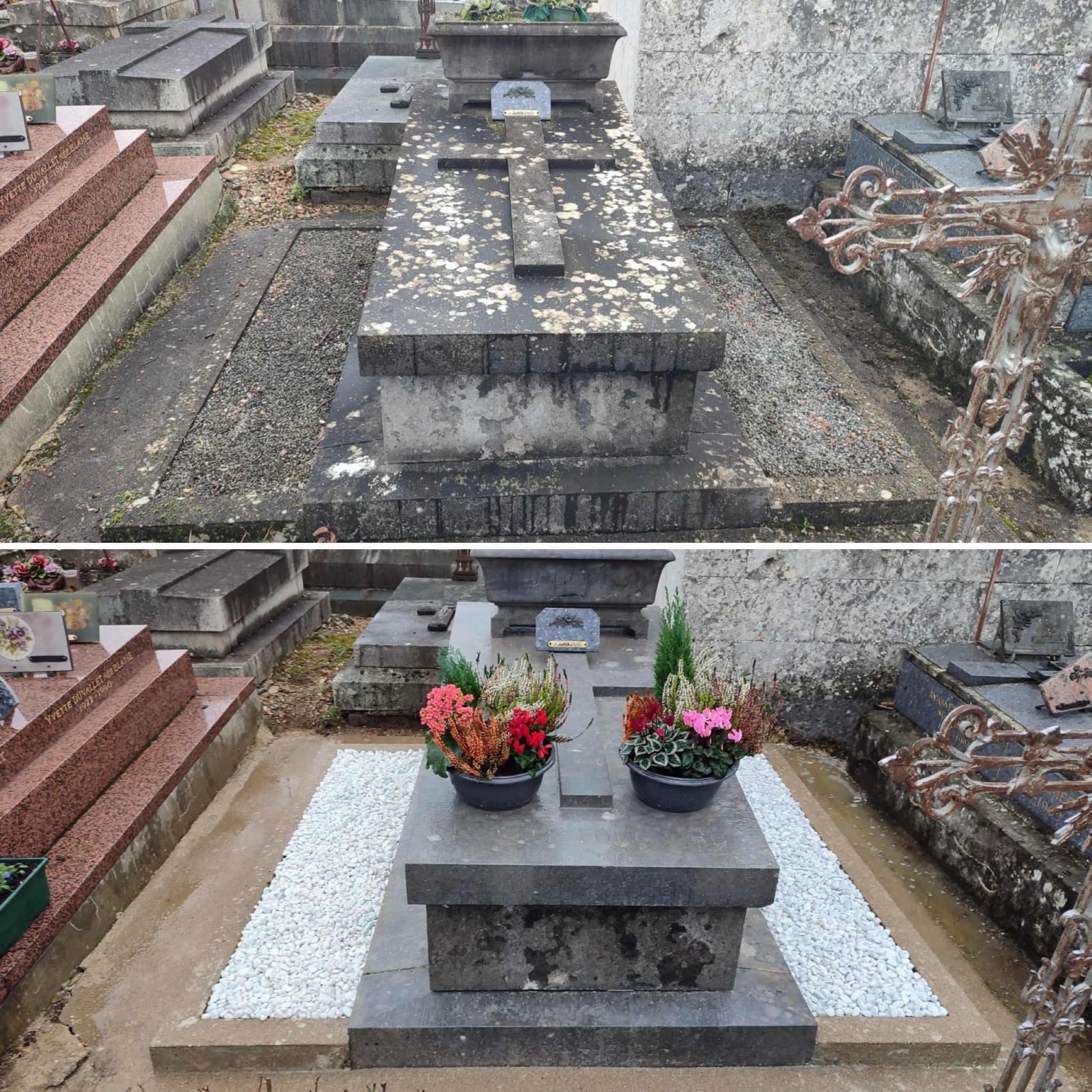 Nos interventions comprennent systématiquement le nettoyage des monuments, le désherbage minutieux, l’embellissement par des compositions florales saisonnières et la remise de photos avant/après pour assurer transparence et sérénité, notamment pour les familles éloignées.