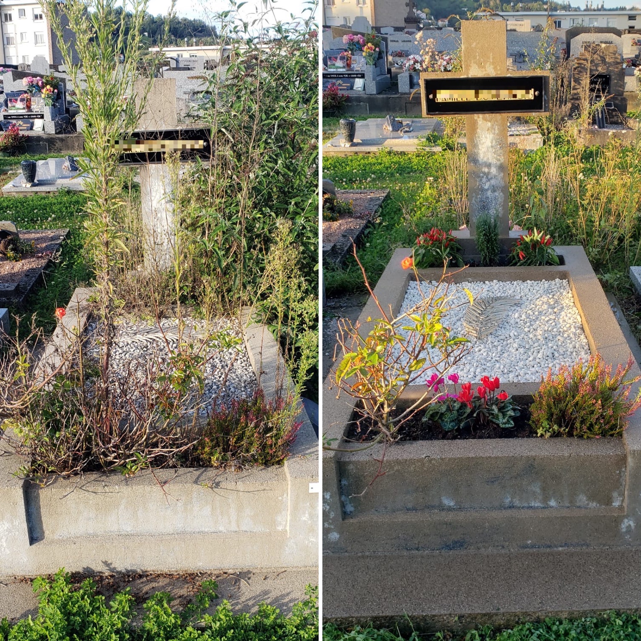 • Entretien paysager : Désherbage minutieux, nettoyage des abords, remise en ordre des éléments décoratifs et de l'ensemble de la concession